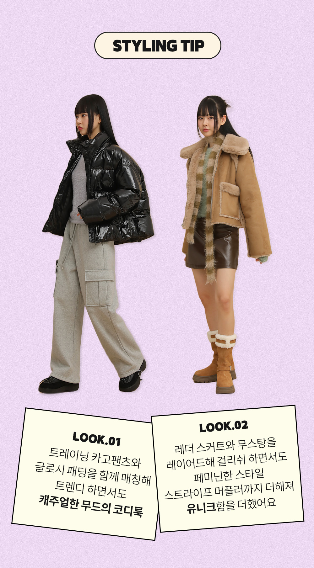 レザースカートとムートンコートをレイヤードした