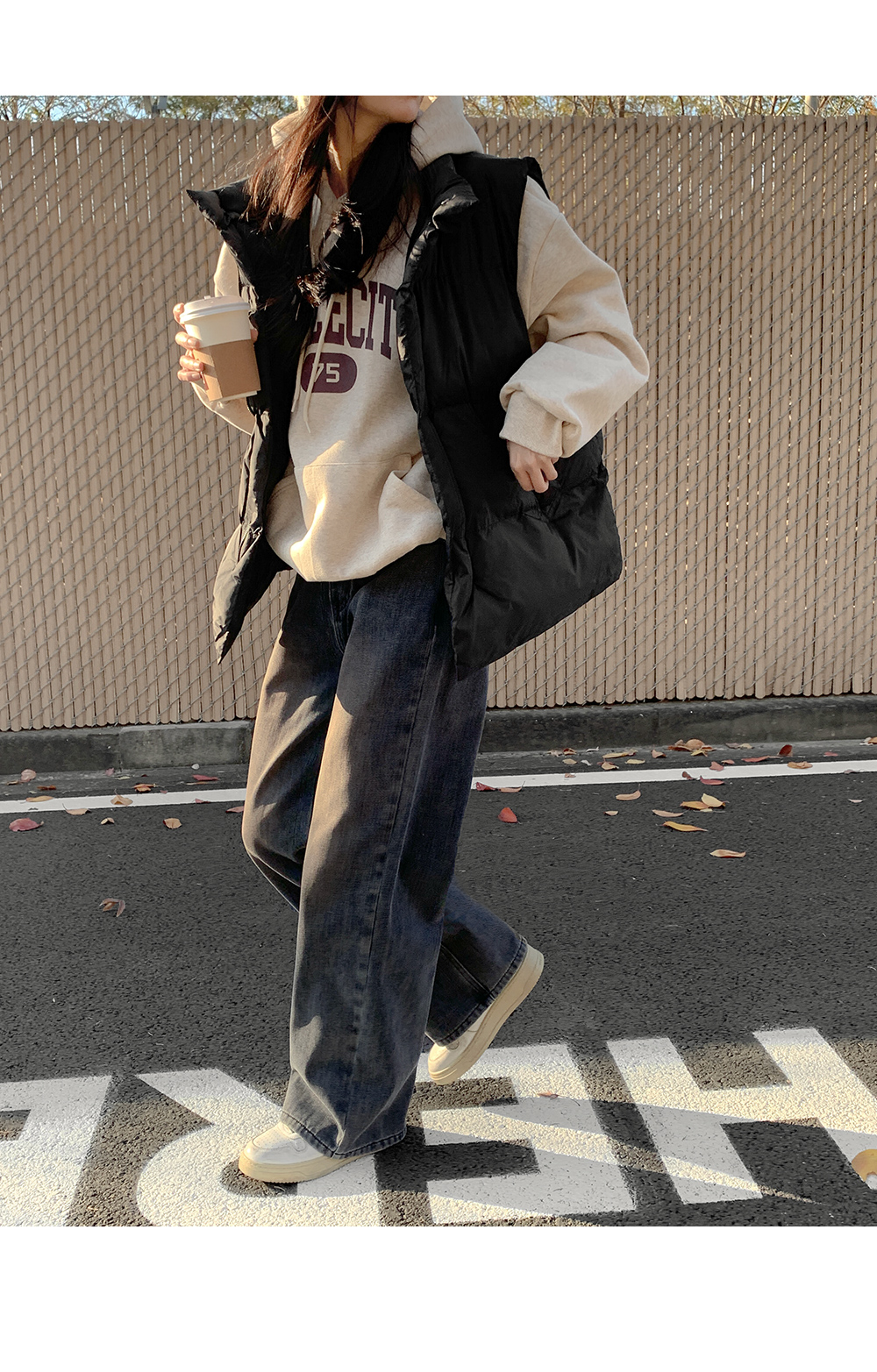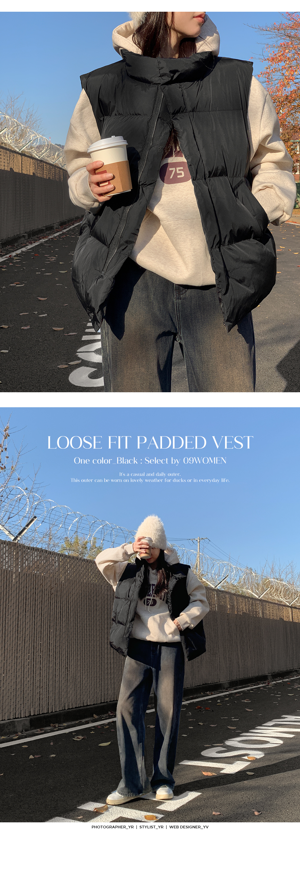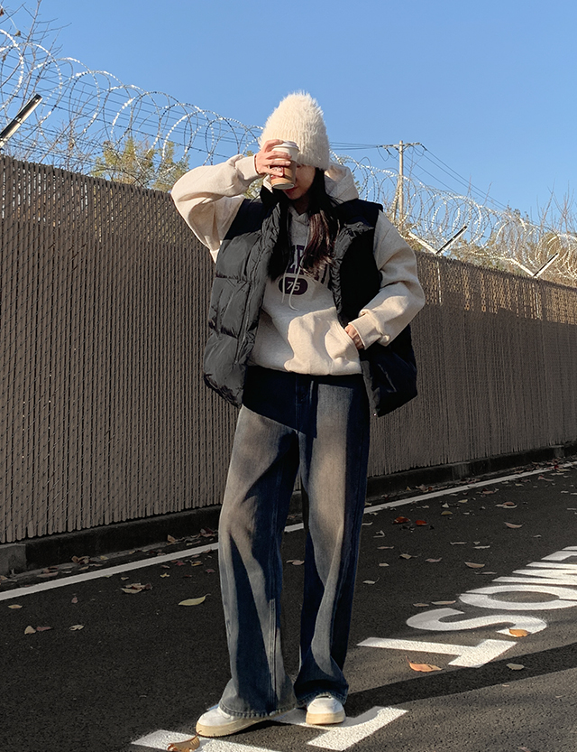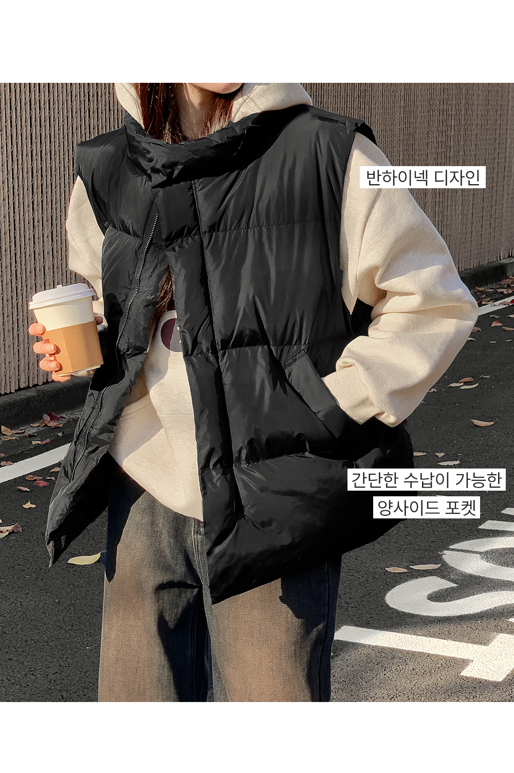 따뜻하게 착용할 수 있는 루즈핏 패딩 조끼에요.