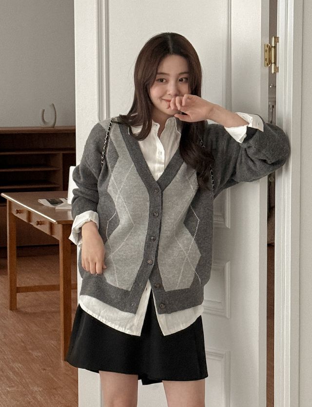 V-neck argyle loose fit cardigan