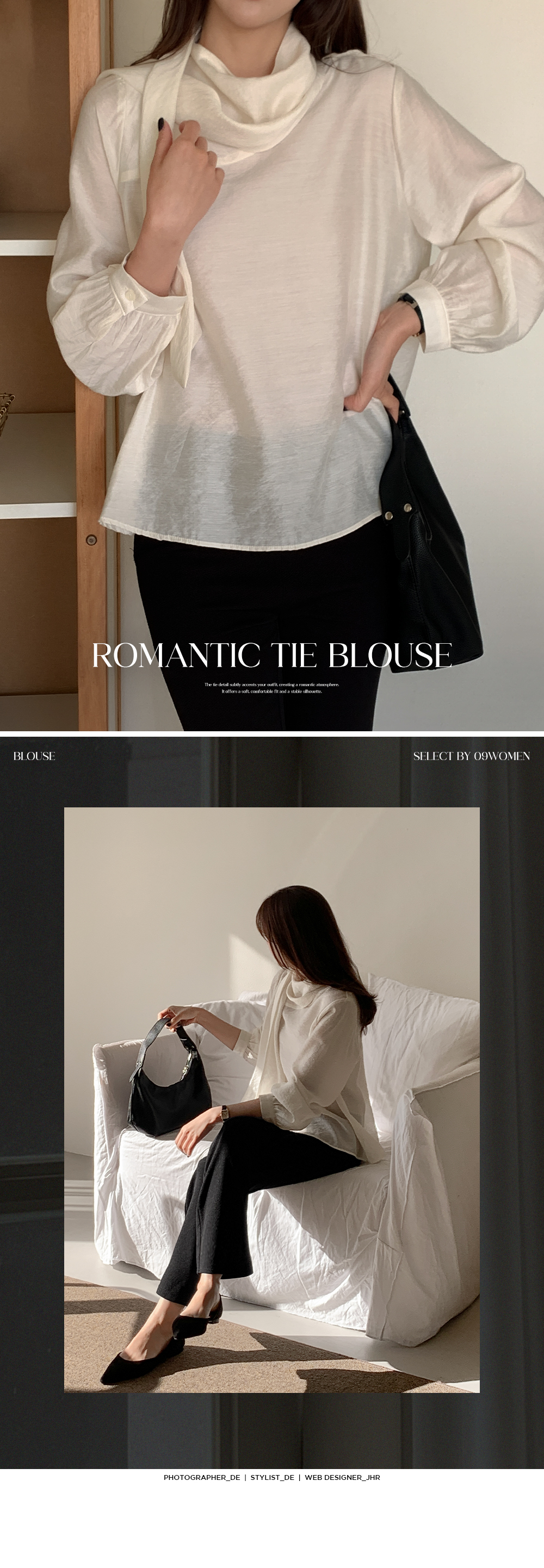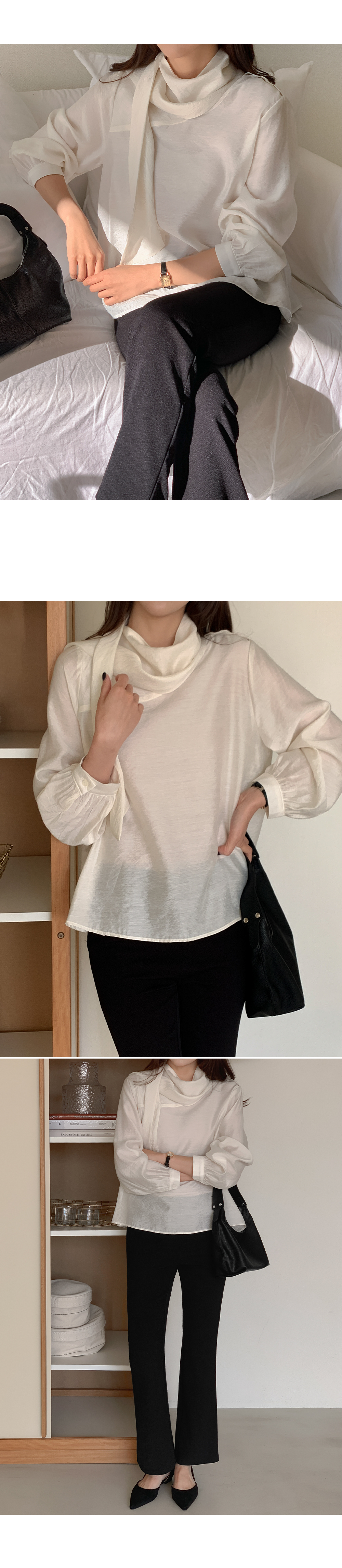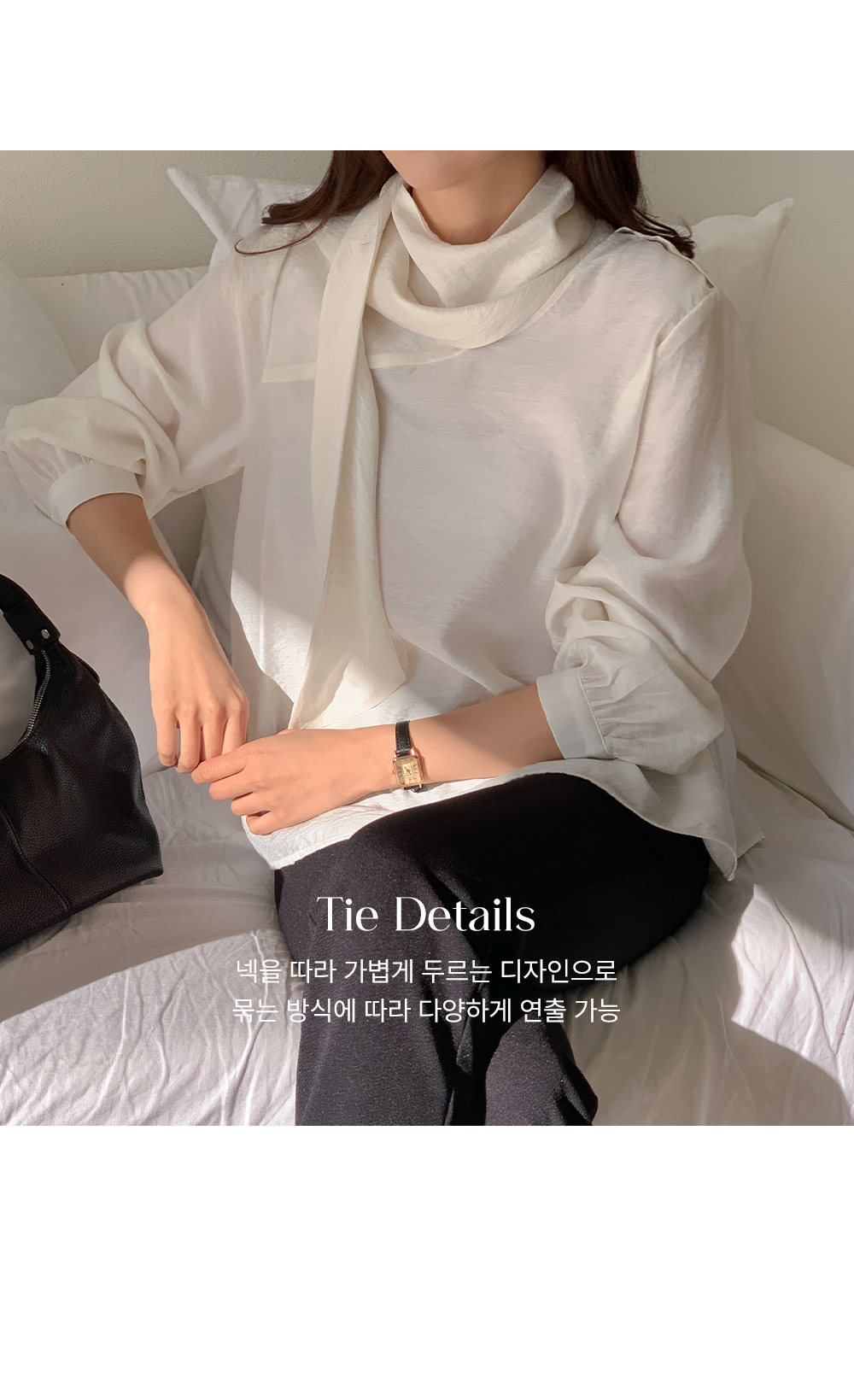 차르르한 원단감으로 분위기를 한껏 끌어올려주는 타이 블라우스예요.