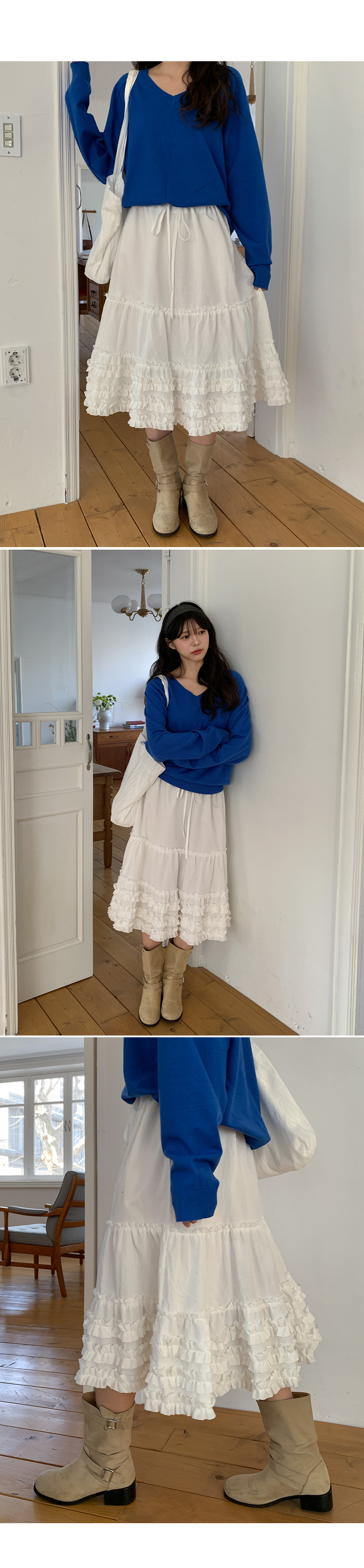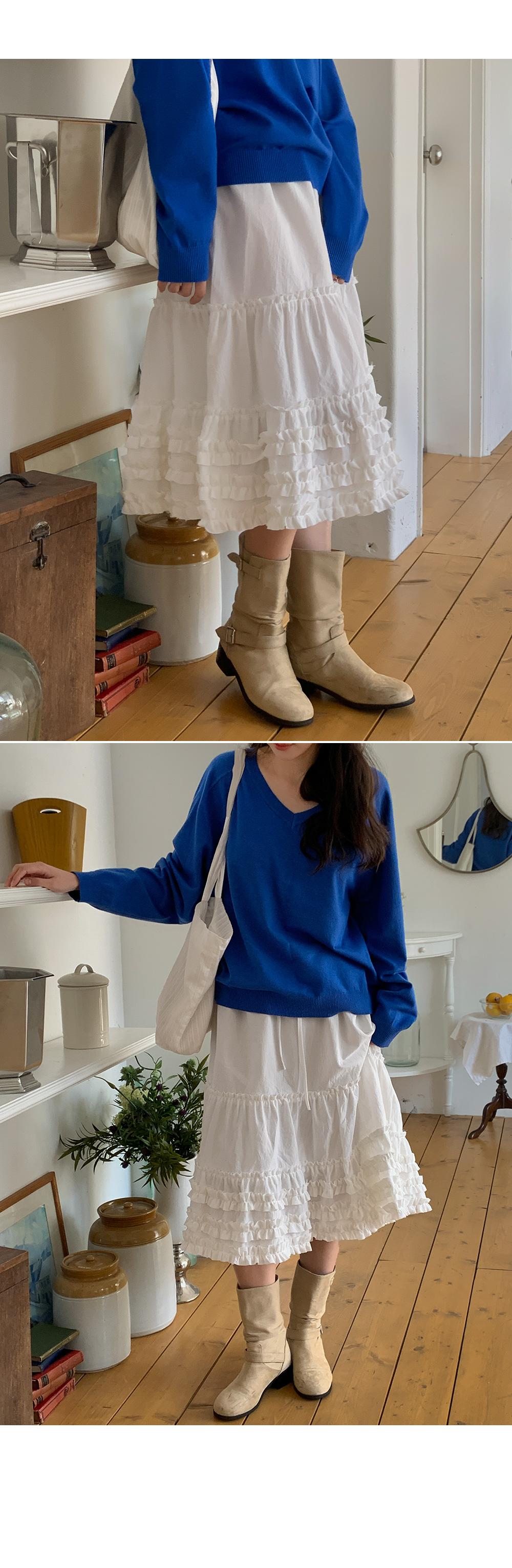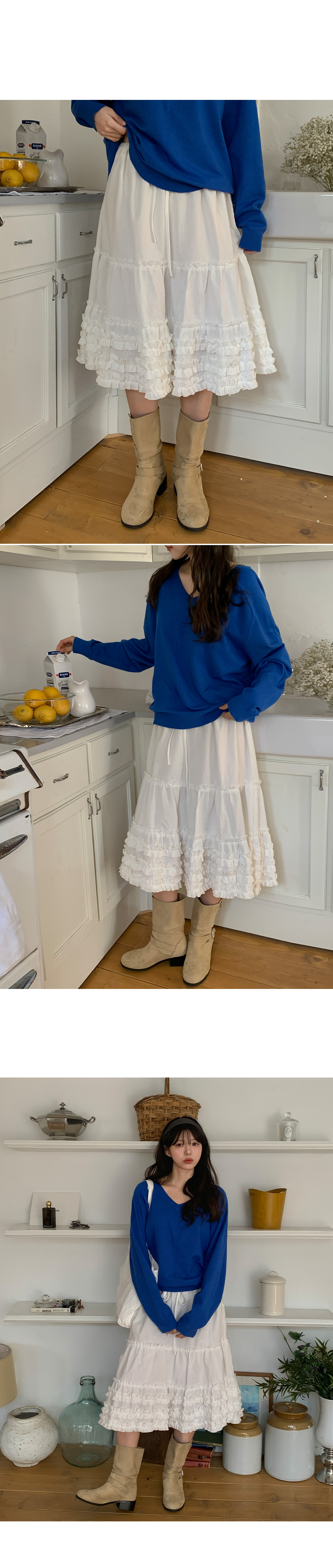 - 무릎을 덮는 미디 기장감으로 부담 없이 착용 가능한 스커트