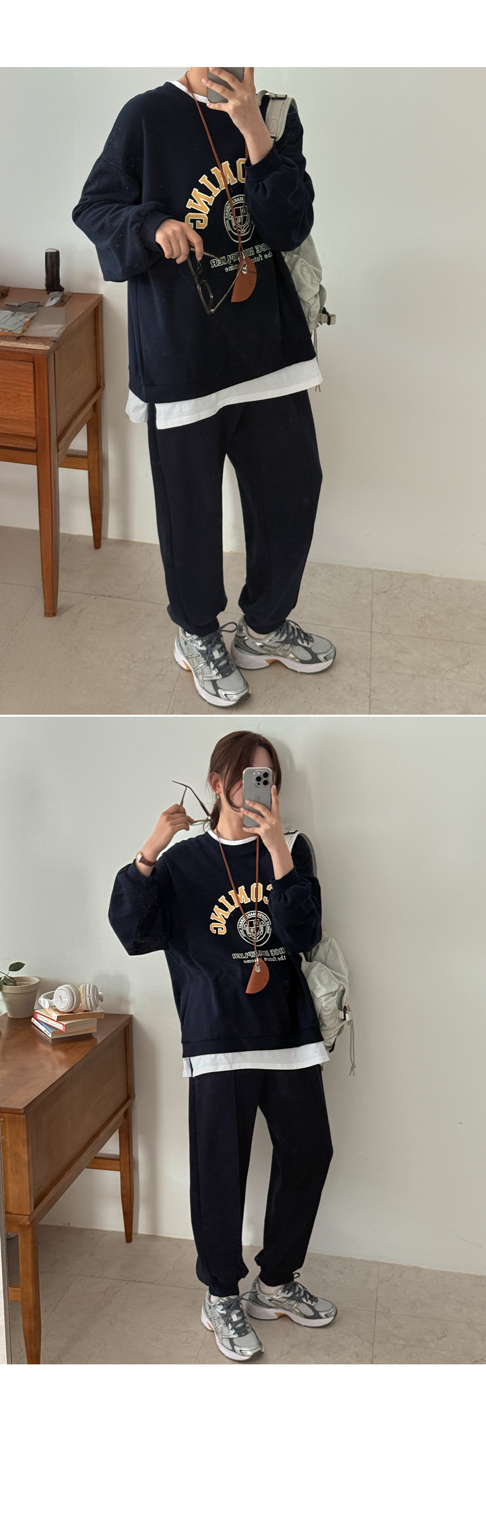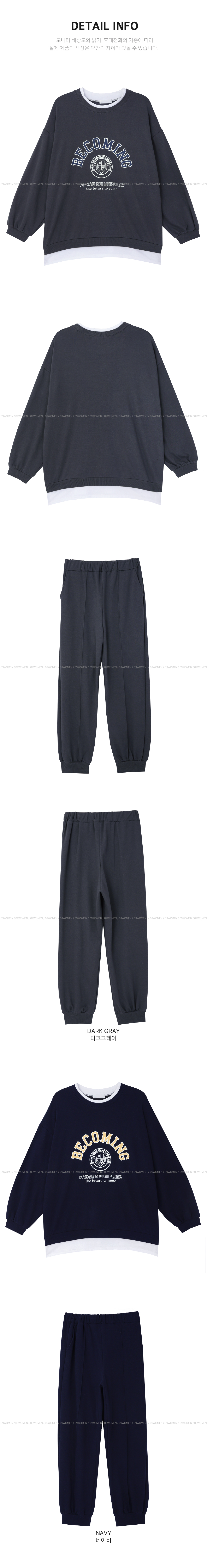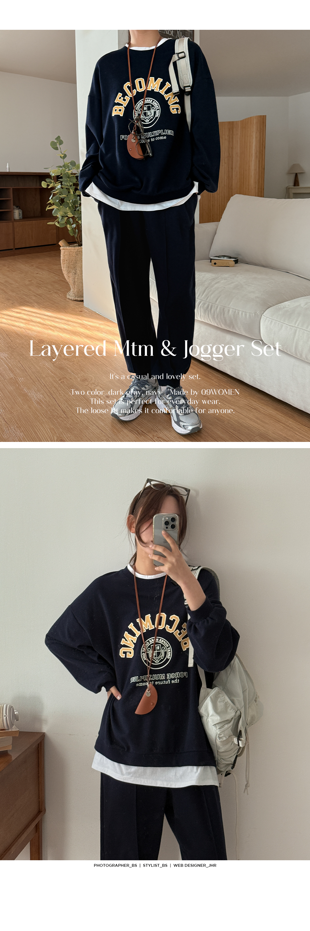 - 레이어드 맨투맨과 편안한 조거 팬츠를 세트로 구성한 아이템