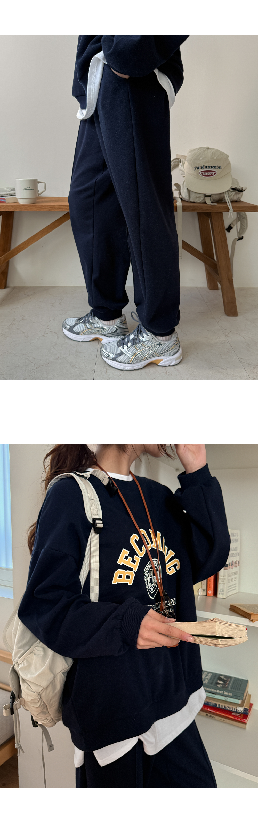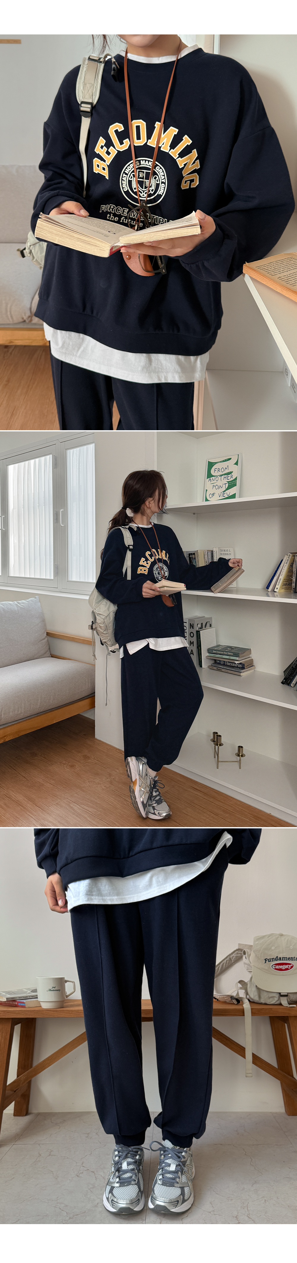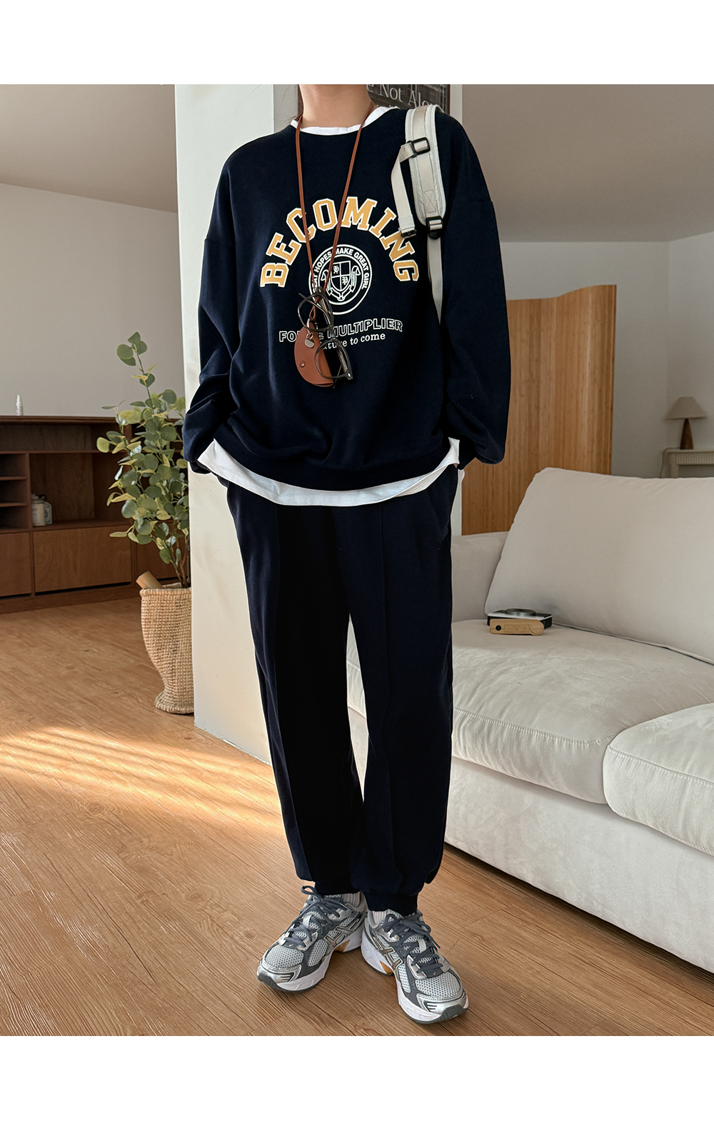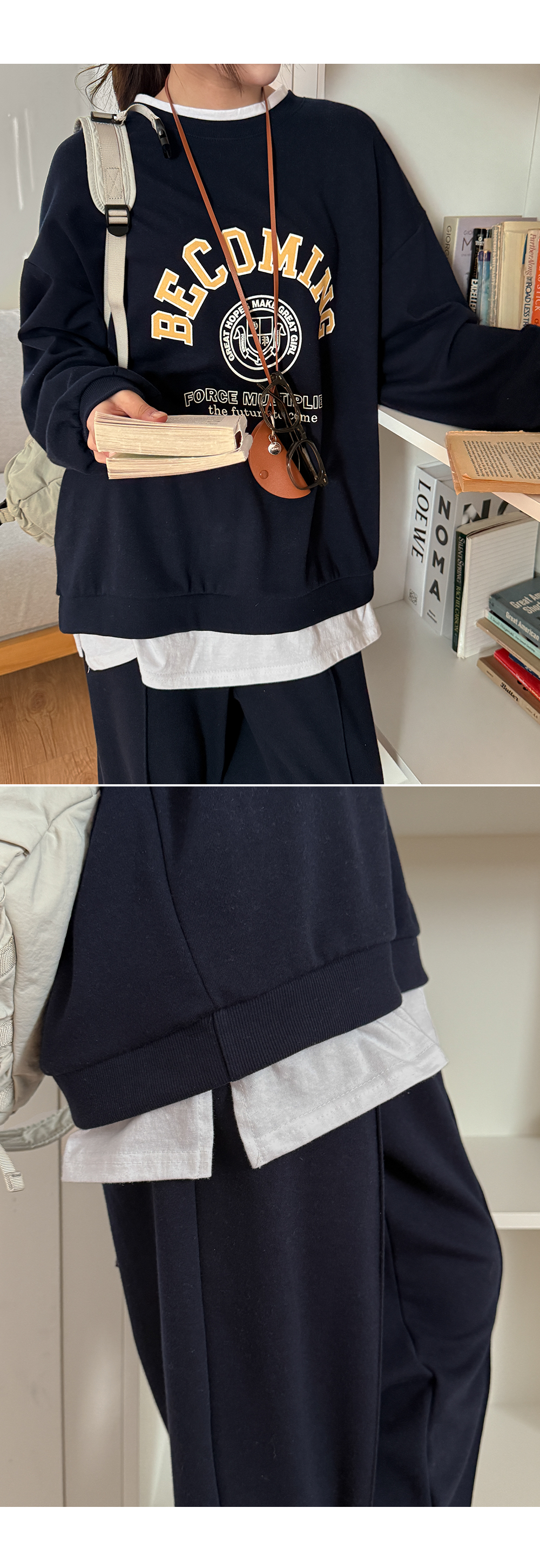 - 레이어드 맨투맨과 편안한 조거 팬츠를 세트로 구성한 아이템