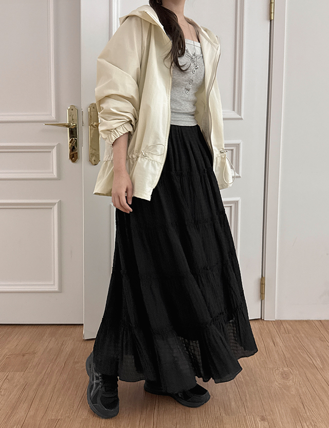 페미닌하게 즐기기 좋은 티어드 밴딩 롱 스커트를 소개해드려요.