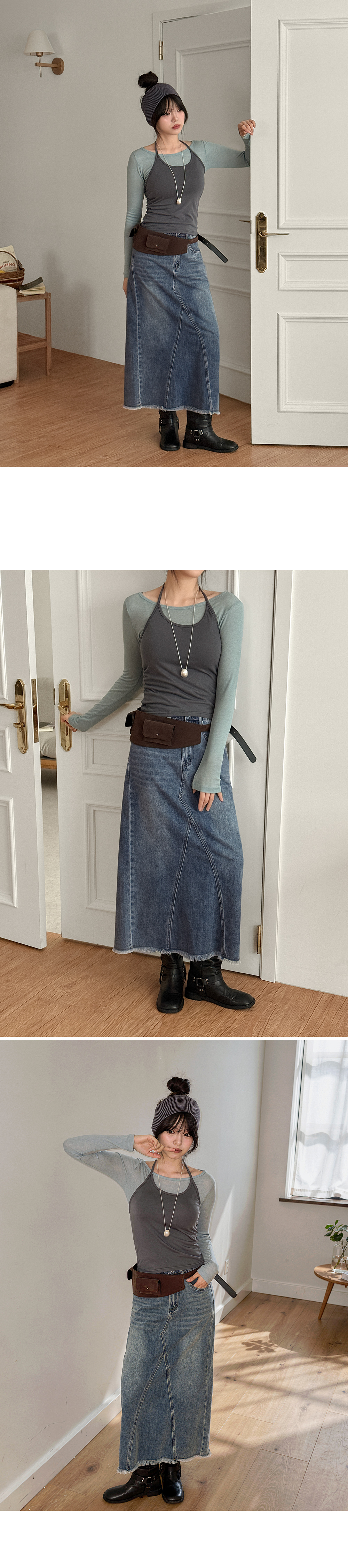 Back banding denim long skirt
