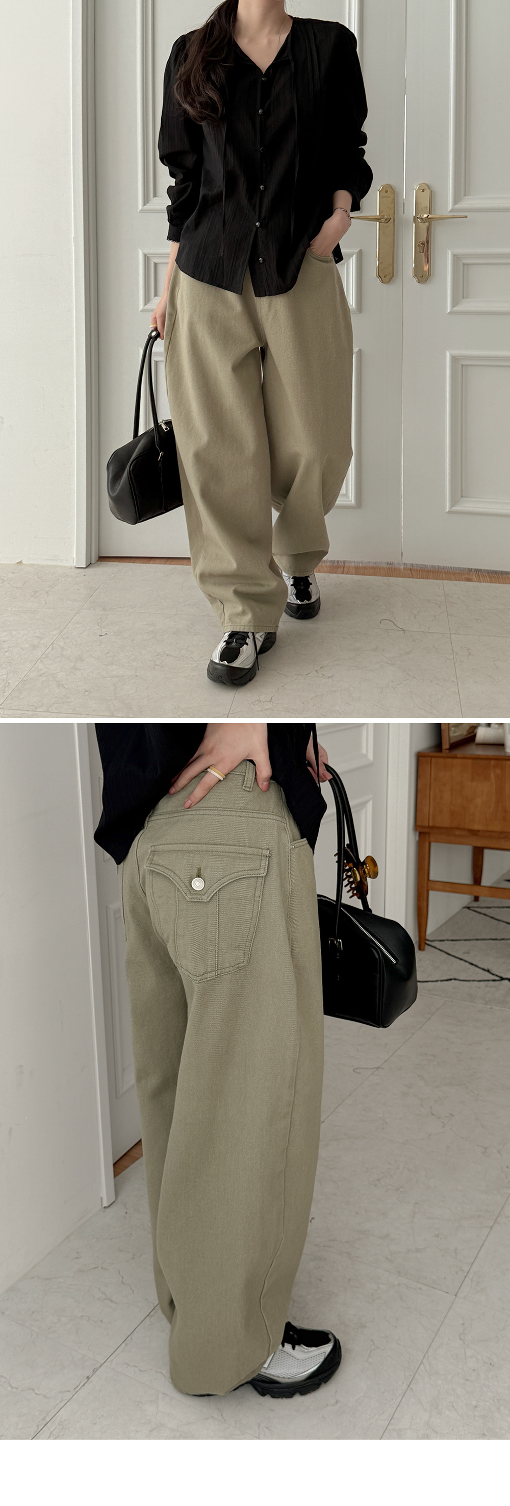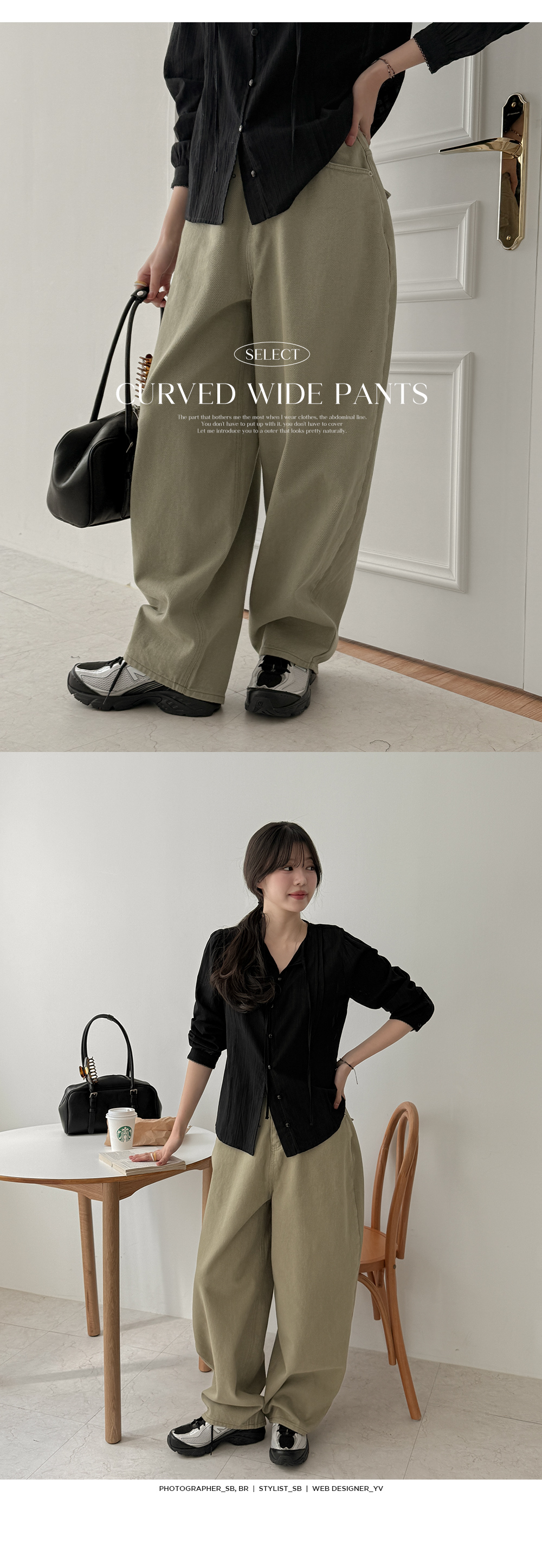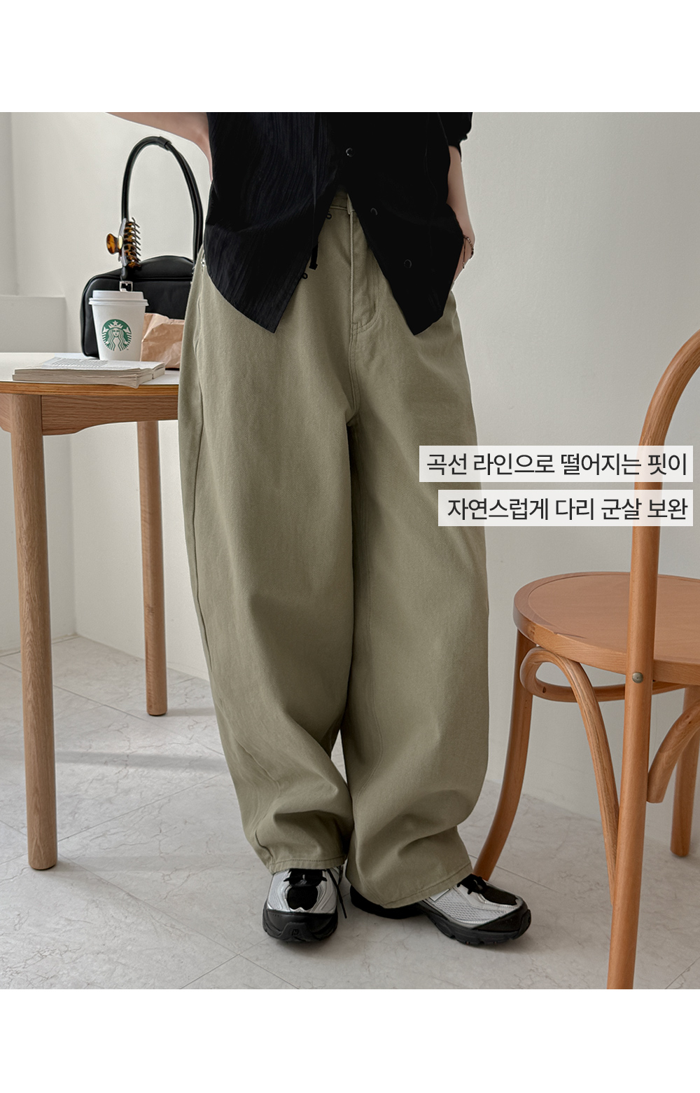 - 트렌디한 커브드 실루엣이 돋보이는 와이드 팬츠