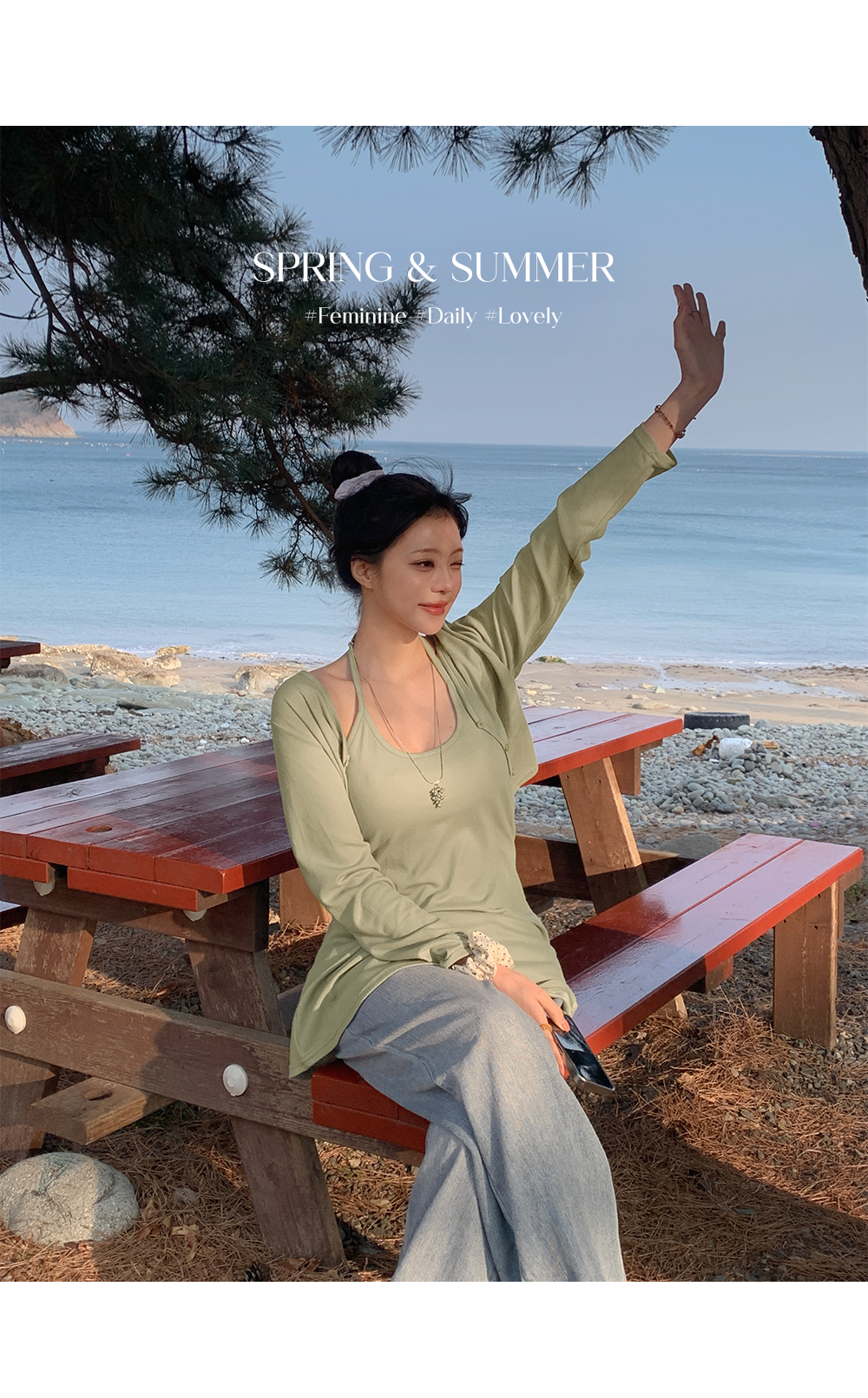 - 크롭 기장으로 상체 비율을 길어 보이게 연출