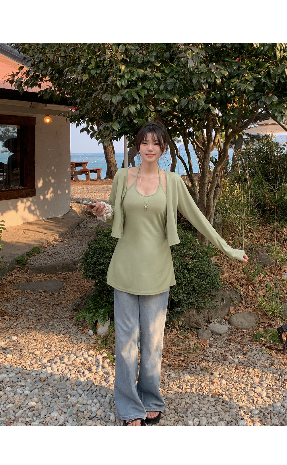 크롭 가디건은 상체 비율을 훨씬 길어 보이게 연출해 줘요.