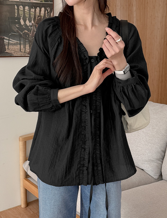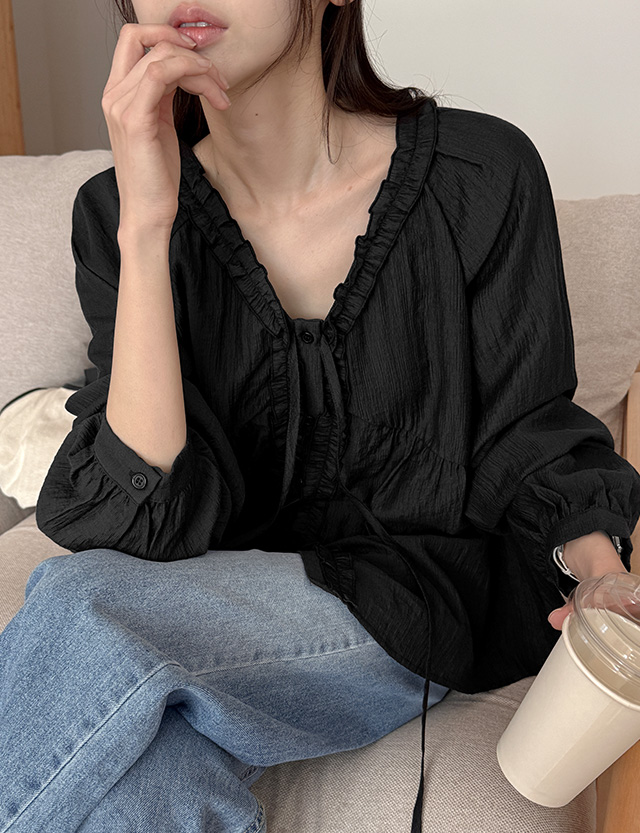프릴이 더해진 V넥 디자인이 목선을 길고 여리하게 연출하며,