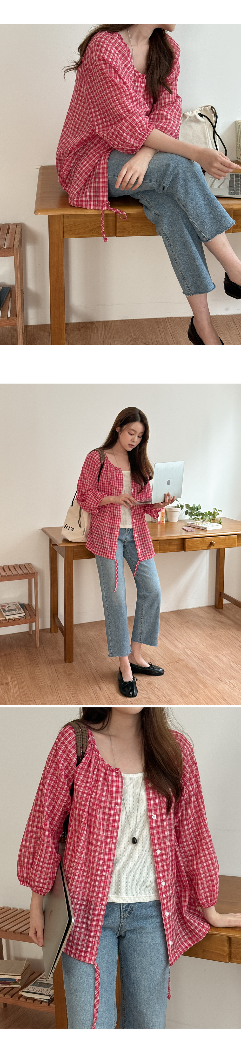 • 레버튼 チェック 셔링 ブラウス 87329