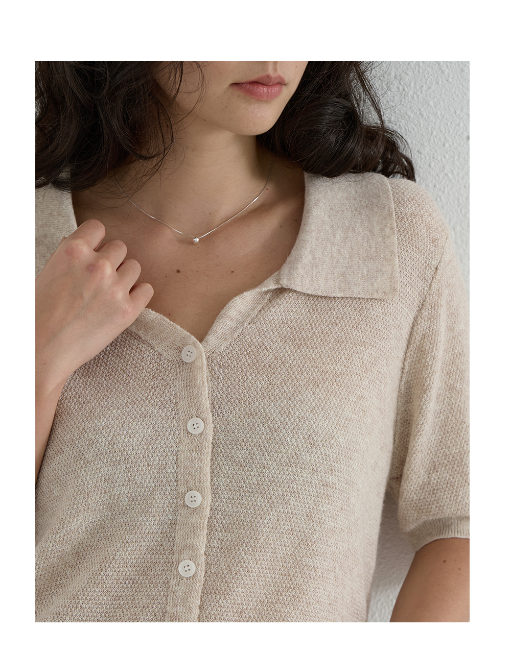 브이넥 오픈카라 디자인으로, 답답해보이지 않는 넥라인
