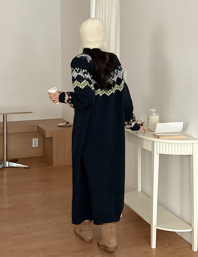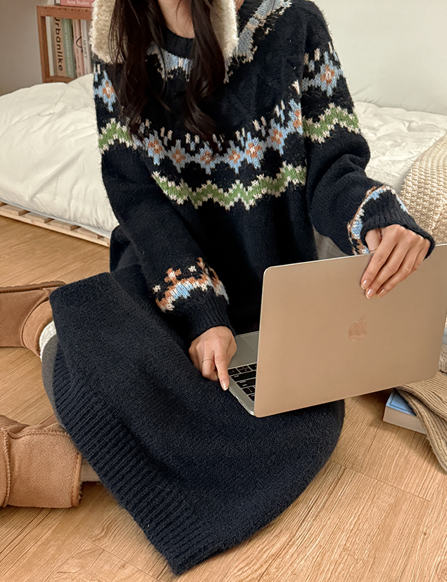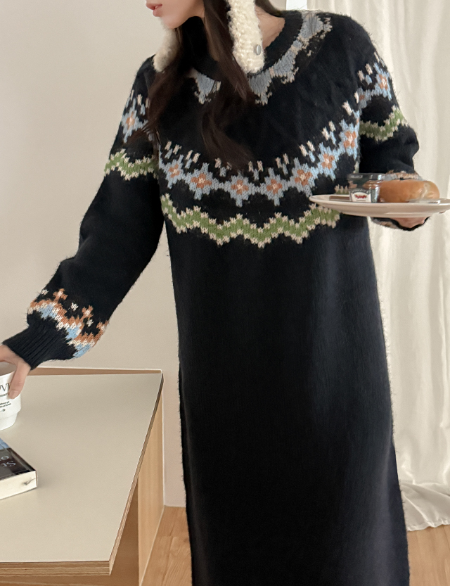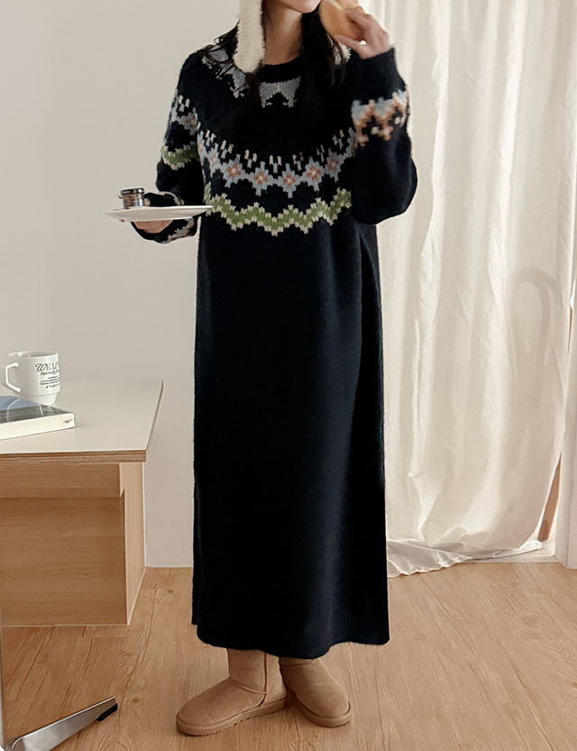 두엔 ラウンド ノルディック パタン ニット ロング ワンピース 85717