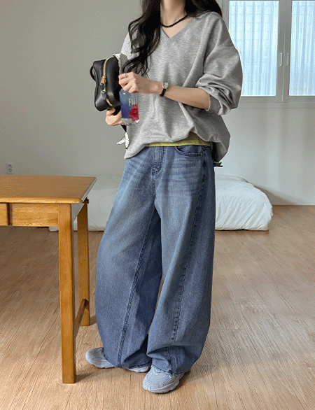 모아 포켓 ステッチ 커브 ワイド デニムパンツ 86302