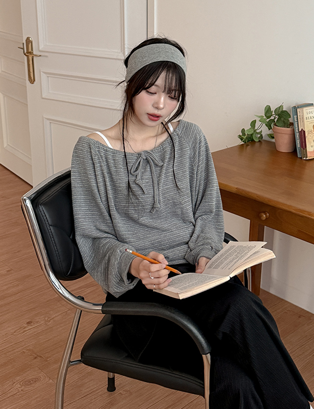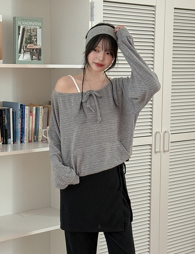 웨윤 ストリング オフショルダー ストライプ ティーシャツ 86389