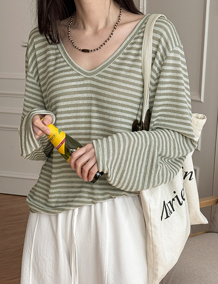 파베론 부클 Vネック ストライプ ティーシャツ 87375