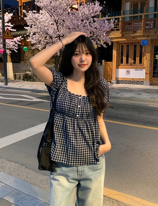 유라잉 チェック 셔링 ブラウス 87399