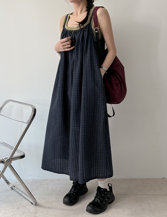 릴렉스 체크패턴 포켓 袖なし ロング ワンピース 87569